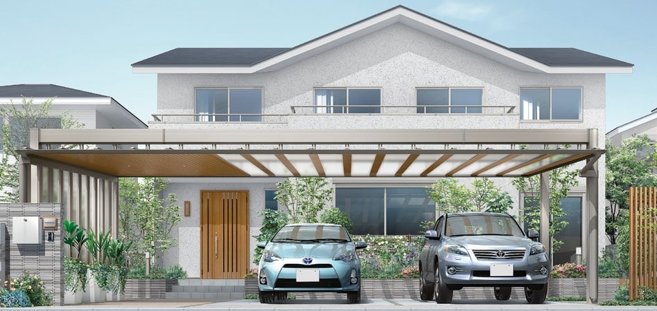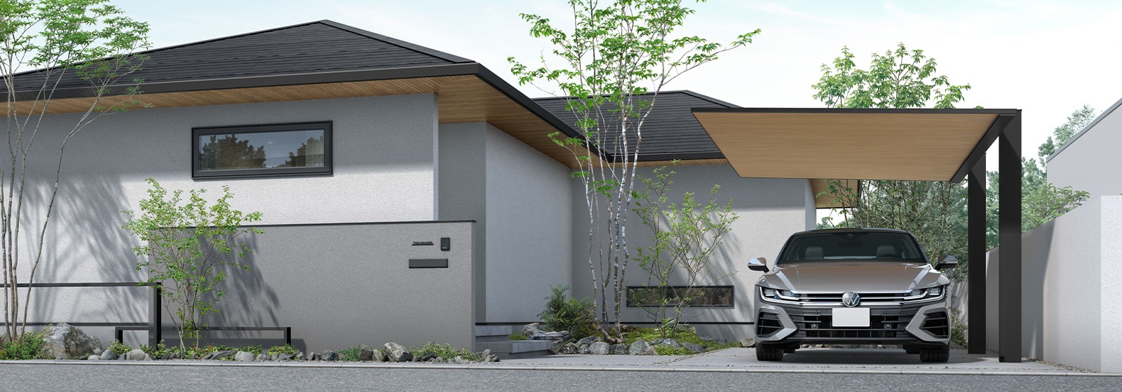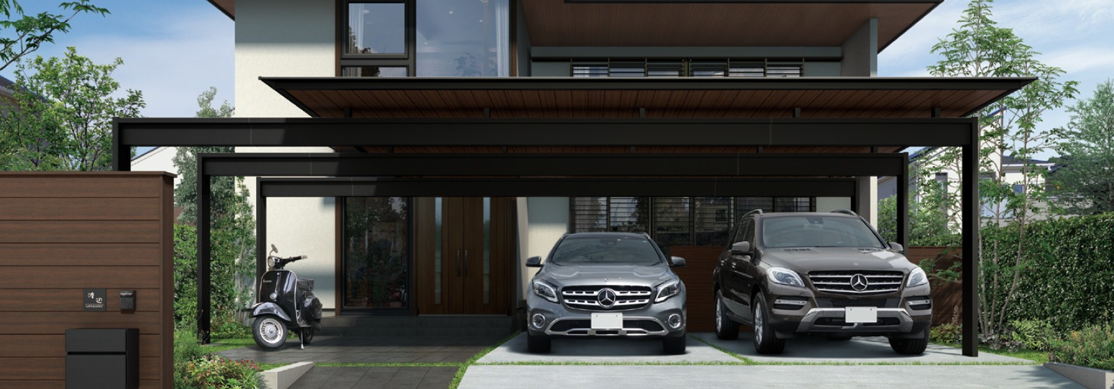 こちらもYKKAPのカーポートで、高級感のあるデザインが特徴です。単に車を守るためのカーポートではなく、家族が楽しく過ごせる場であることをコンセプトにしています。