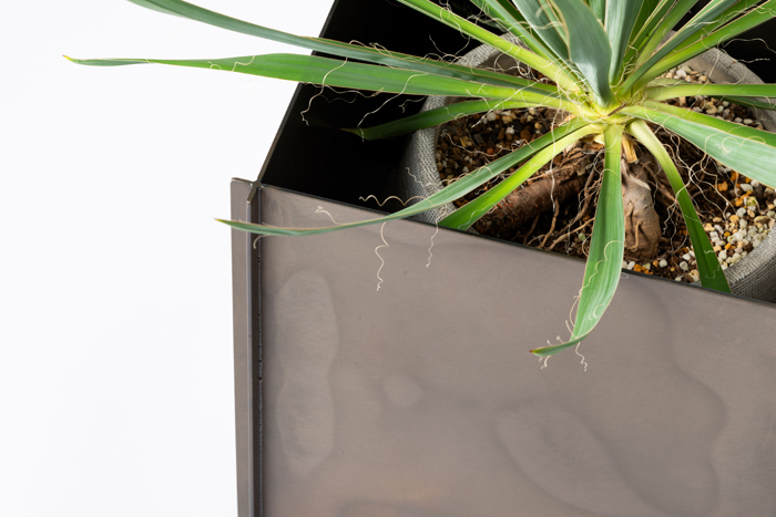 近年の「アイアン調」という偽物感あふれる言葉にアンチテーゼを投げかけるような質感は、プラントボックス『鉄鉢(テッパチ)』、スチールシェルフ『STELF(ステルフ)』、鉄巾木『ハバテツ』に適用することが可能で、家具、設備の可能性を大いに広げます。