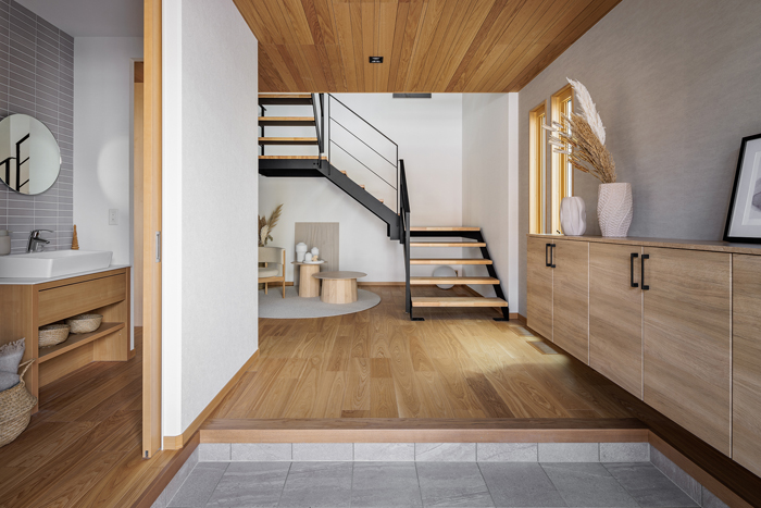 大手住宅メーカーの展示場デザインでも、真鍮色を採用したり、無垢材を採用したりと、自然素材をふんだんに配した空間がつくられています。