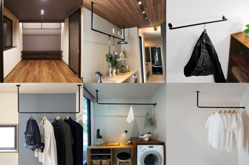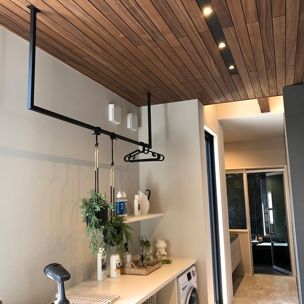 ランドリールームを設置するなら、部屋に合う物干しを考えておきたいです。物干しは、置き型、天井取付型のものもあります。