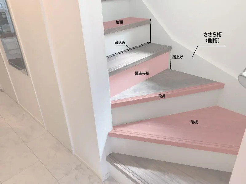 段板は足を乗せる板のことです。蹴上げは一段ごとの高さを指します。踏面は段板の奥行きを指します。以下の画像を見ていただくと、イメージしやすいかと思います。