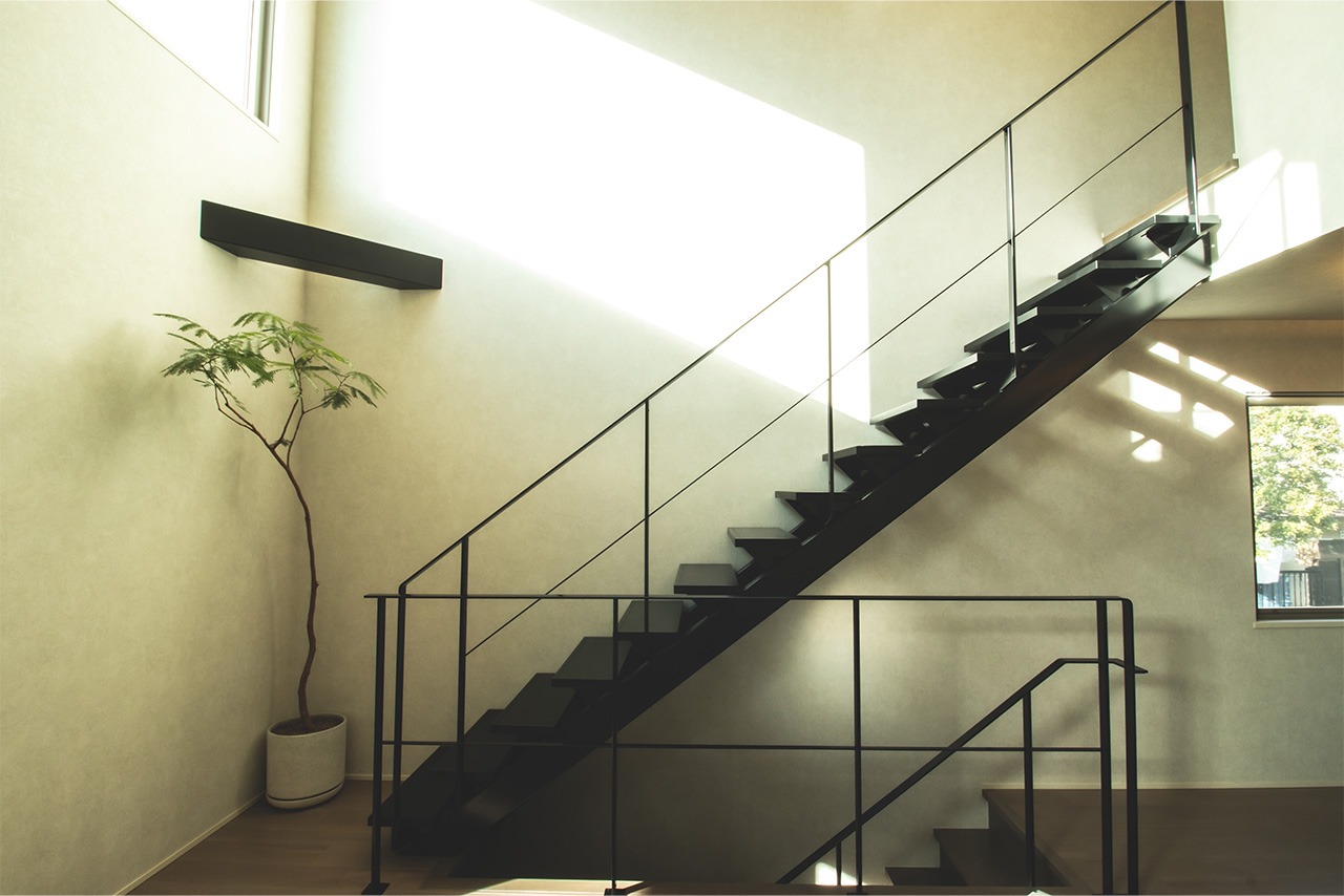 鉄骨階段らしいシンプルでスタイリッシュなデザインが特徴的です。リビングに設置することで、リビングのかっこよさを高められます。家族が自然とリビングに集まるようになり、コミュニケーションが増える効果も期待できます。