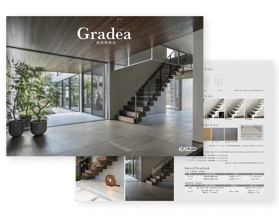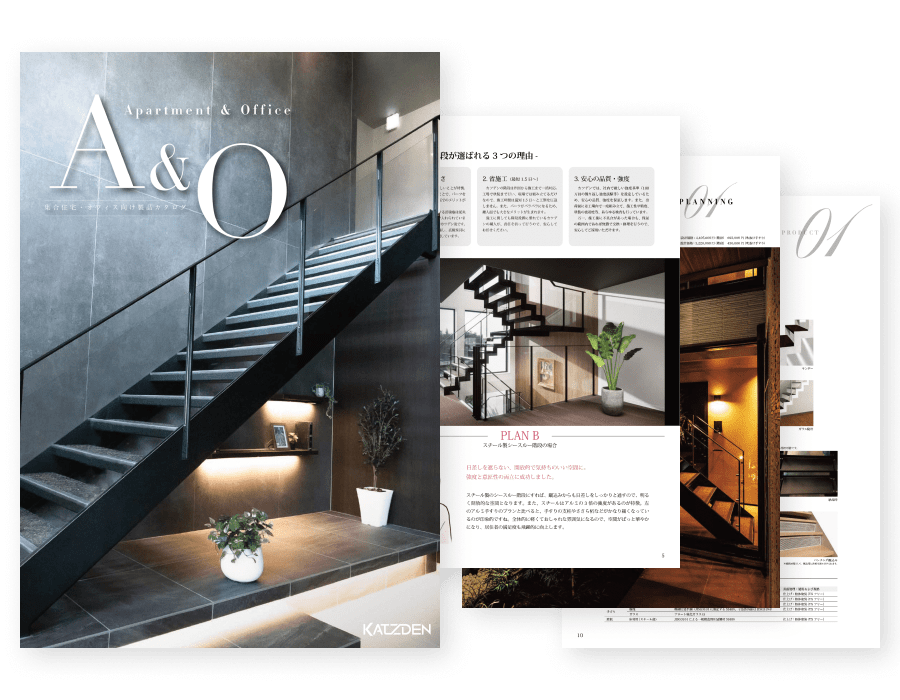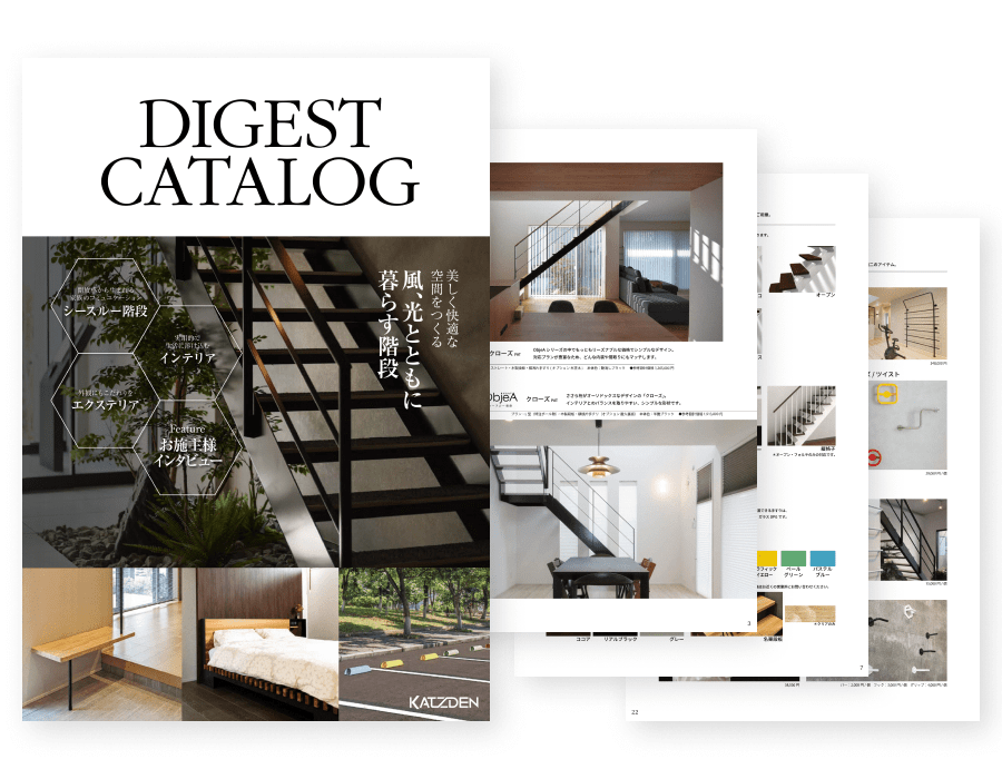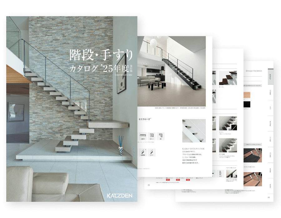 カツデンの階段・手すりは、インテリアデザインのテイストや、家族構成、間取りに合わせて、幅広いバリエーションから選択できることが特徴です。 -