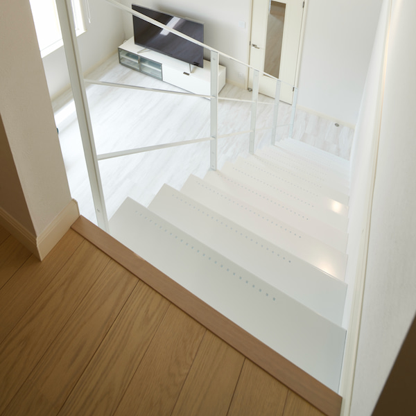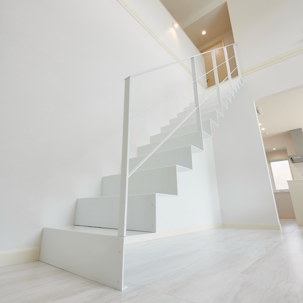まるで1枚の板を曲げたように見えるデザインの片持ち階段。