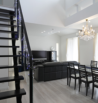 吹抜けと吊るし照明が魅力のモノトーンハウス