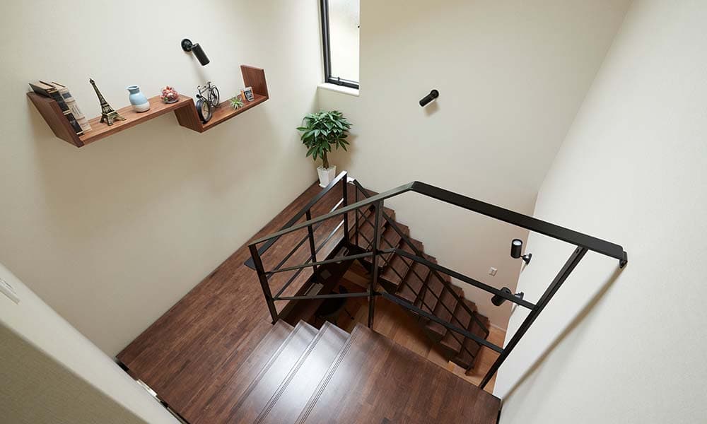 ---踊り場の壁に取付けた棚と相まって、おしゃれな空間になってますね。