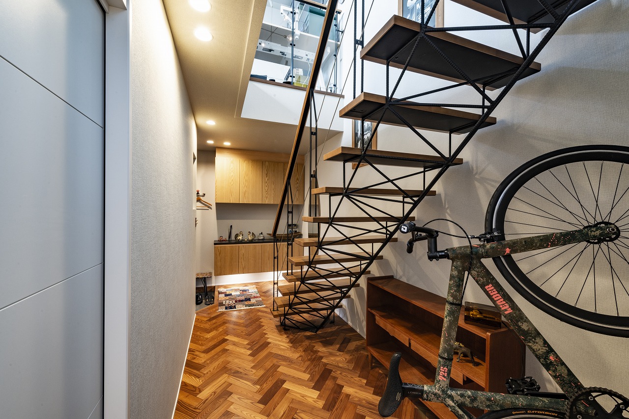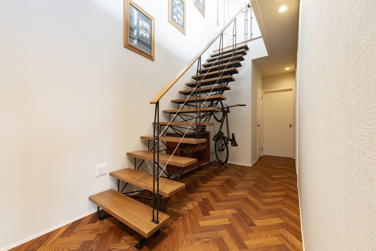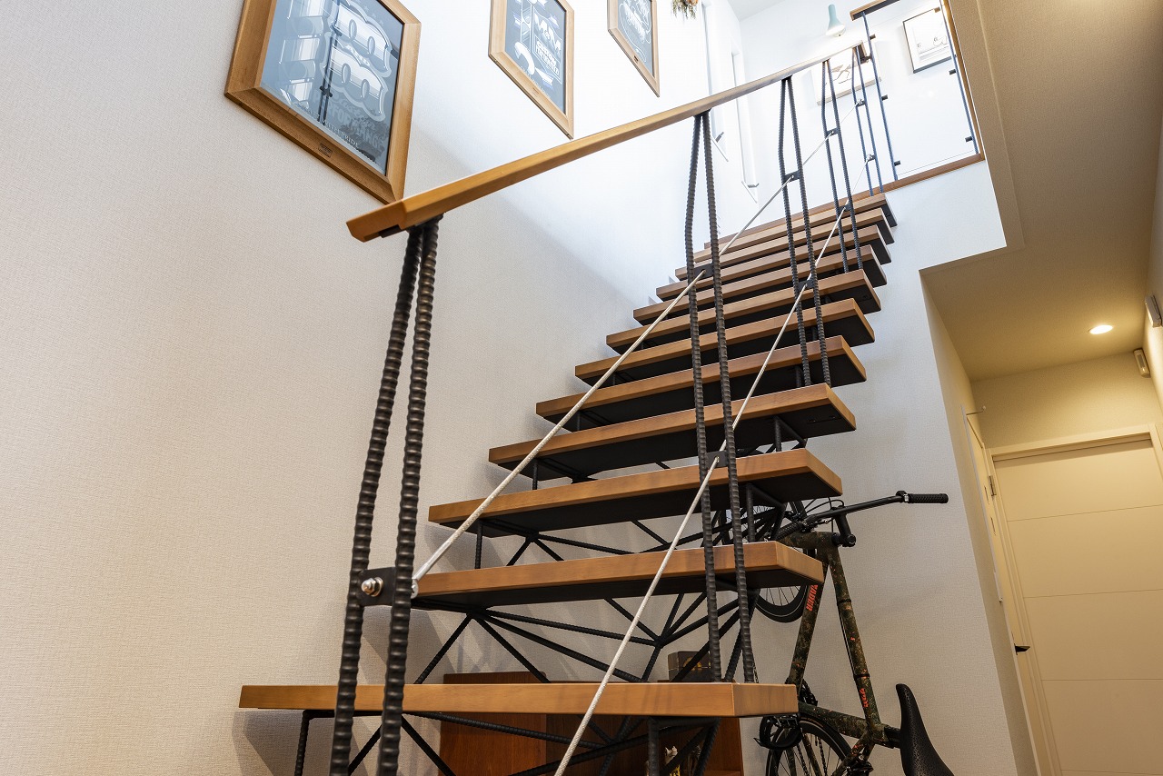 最初は壁から段板だけ出ているような、そんな階段を調べていてかっこいいなと思っていたのですが、それだとやっぱり小さい子には危ないなって。あと構造上壁の厚みがないとできないということで。そんな中でショールームに行ったら「これだ!」って(笑)