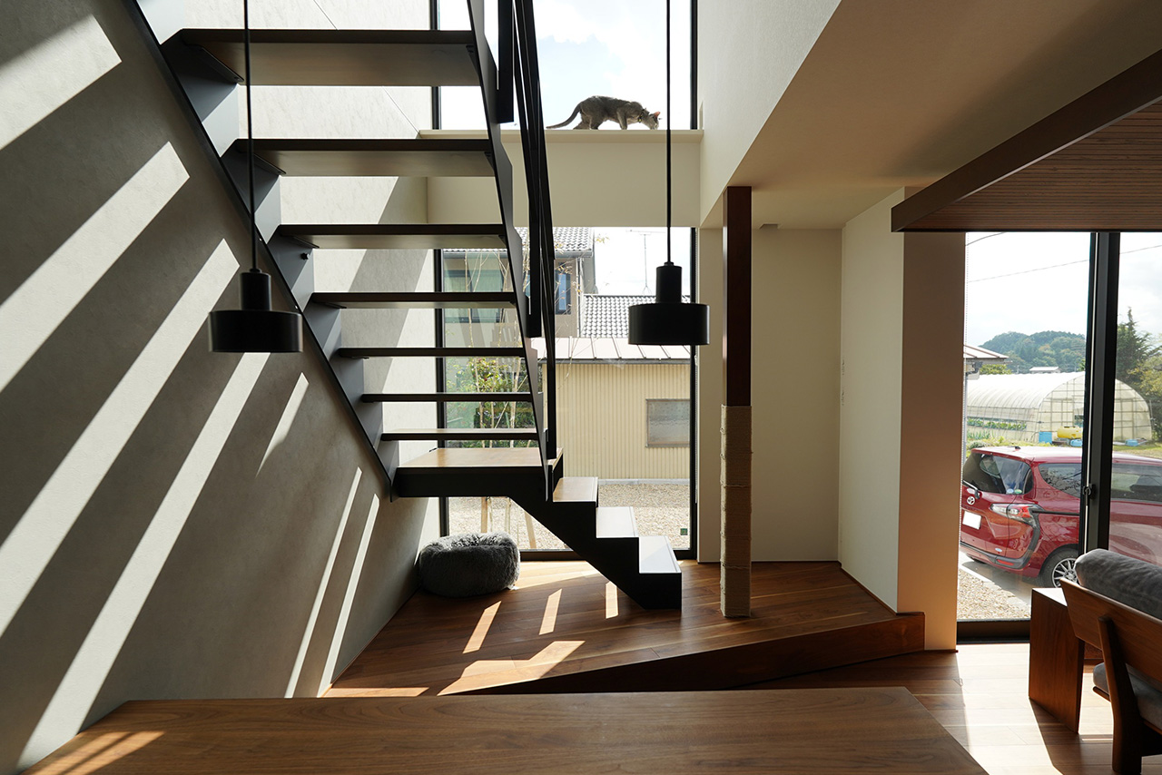 飼い猫たちはいつも階段の踊り場や、階段上部の出窓部分で日向ぼっこをしています。窓から入る自然光は部屋全体を明るくしてくれますし、内装の色味も鮮やかに映るので、私たち自身もかなり気に入っています。