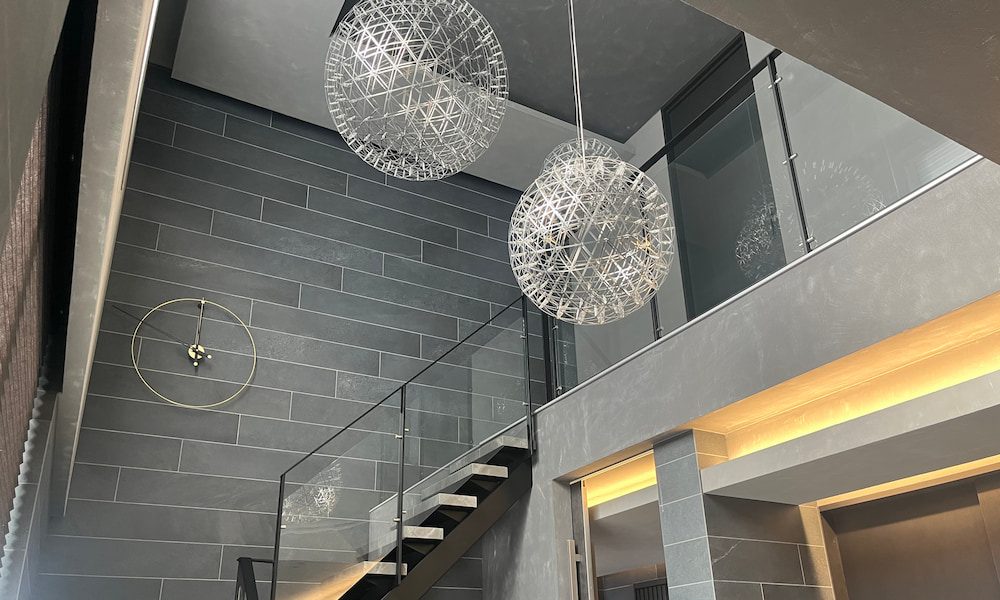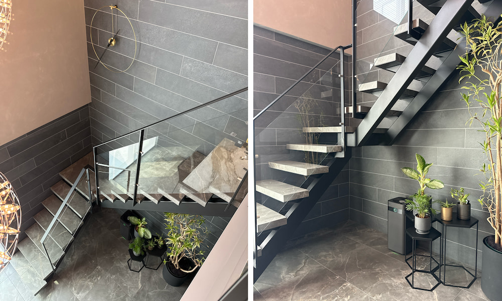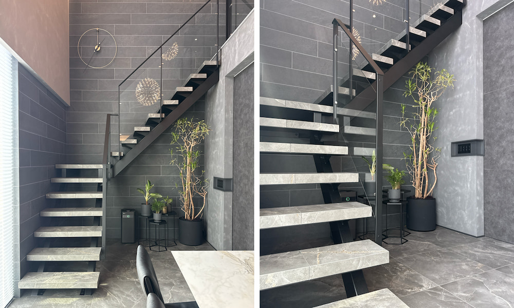 フロアと段板がタイルで統一され、グレートーンの美しい空間にマッチする階段を納入できたことを嬉しく感じています。